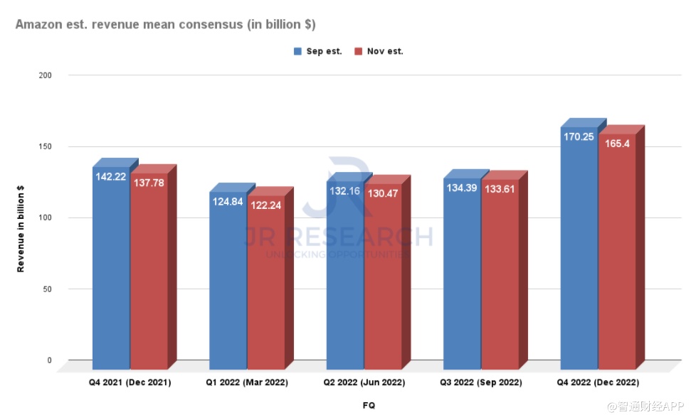 第三季度财报公布后,市场对亚马逊2021年第四季度营收的预期比9月(公布第三季度财报前)显著下调了3.1%。 然而,2022财年的预期仅受到轻微影响。 这意味着,市场普遍认为亚马逊在2022财年的营收将正常化,预计将同比增长15%至20%。 因此,有关亚马逊增长将大幅放缓的担忧可能被夸大了。