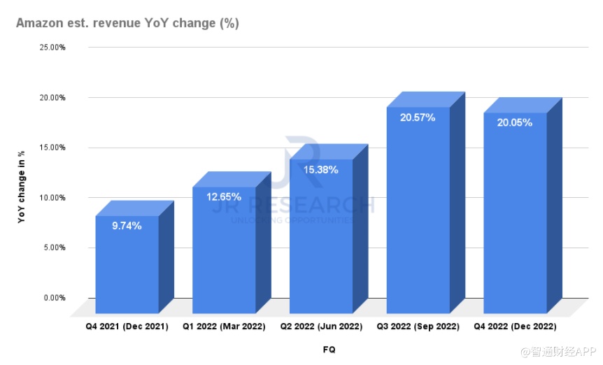 亚马逊季度营收同比增长预期。 数据来源:S&P Capital IQ
