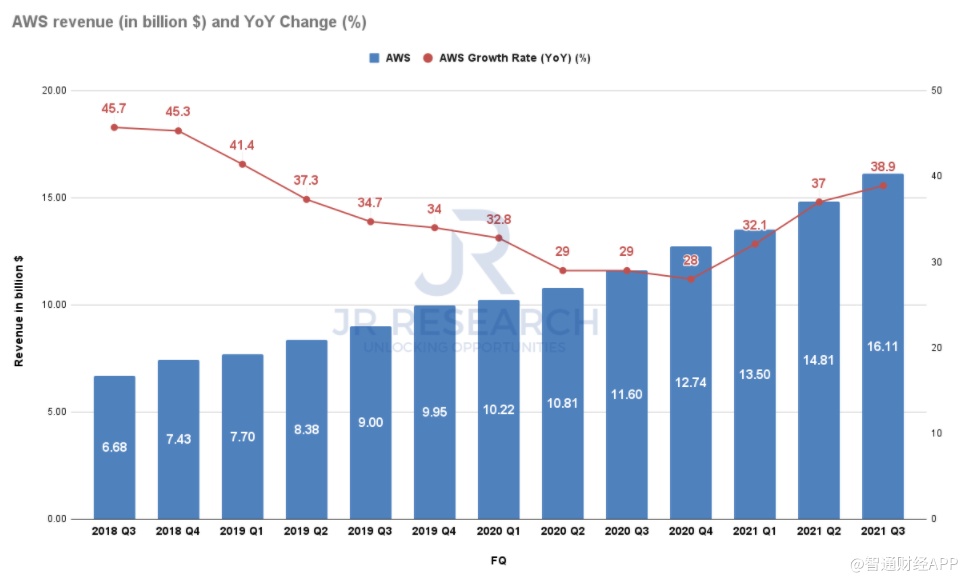 AWS是推动亚马逊营收增长的重要驱动力。财报显示,AWS第三季度营收为161.10亿美元,分析师预估154亿美元,较上年同期的116.01亿美元增长39%,在总营收中的占比为15%。尽管该公司的电子商务业务增长放缓,但AWS仍保持了强劲的增长势头。