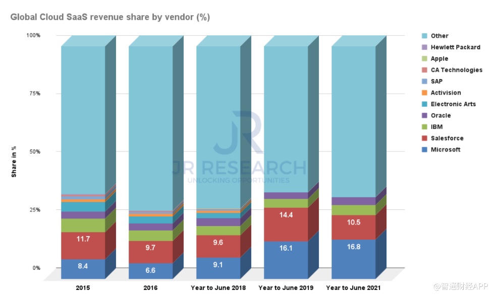 不过,AWS 在云 SaaS 领域面临激烈竞争。微软(MSFT.US)的Azure在云SaaS领域领先竞争对手。 从2021年上半年开始,微软甚至成功地从最接近它的竞争对手Salesforce (CRM.US)那里赢得了市场份额。 微软将其云SaaS市场份额扩大到16.8%,进一步巩固了其在市场中的领导地位。