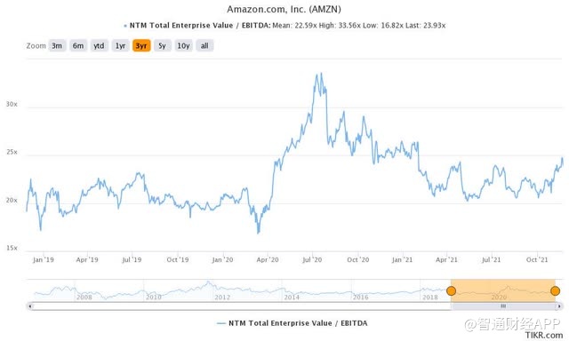 亚马逊企业价值倍数(EV/EBITDA) 3 年平均值。
