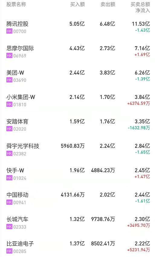 此外,长城汽车(02333)获净买入3495万港元。舜宇光学(02382)、中国移动(00941)分别遭净卖出1.64亿、1.6亿港元。