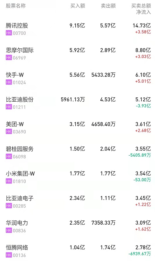 腾讯(00700)获净买入2.14亿港元。消息面上,据央视新闻报道,按照有关部署,工信部对腾讯公司采取过渡性的行政指导措施,主要要求是,对于即将发布的App新产品,以及既有App产品的更新版本,上架前需经工信部组织技术检测,检测合格后正常上架。摩根士丹利发表报告,认为这是正常的合规程序,符合《个人信息保护法》和整改数据泄漏不当行为,对腾讯现有的应用程序和新发布产品影响有限。摩根士丹利对腾讯持“增持”评级,目标价650港元。