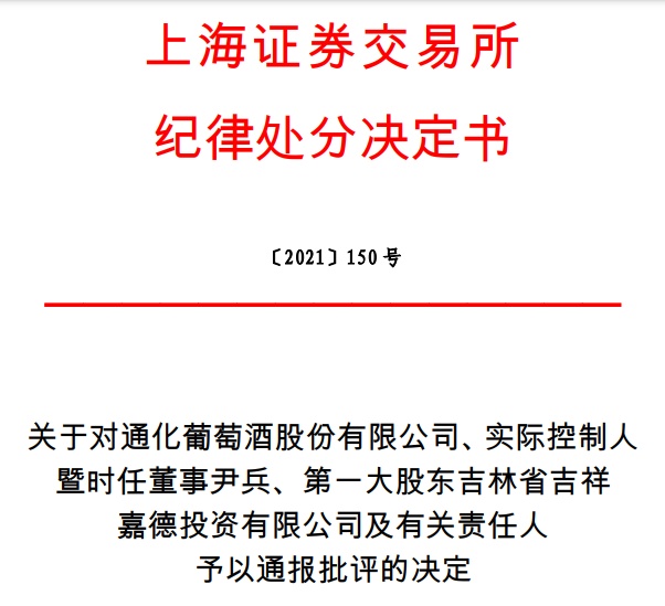 鉴于上述违规事实和情节,上交所对ST通葡及实际控制人暨时任董事尹兵,第一大股东吉林省吉祥嘉德投资有限公司,时任董事长兼总经理何为民,时任财务总监孟祥春,时任董事张士伟、何文中,时任董事会秘书孙永成予以通报批评。