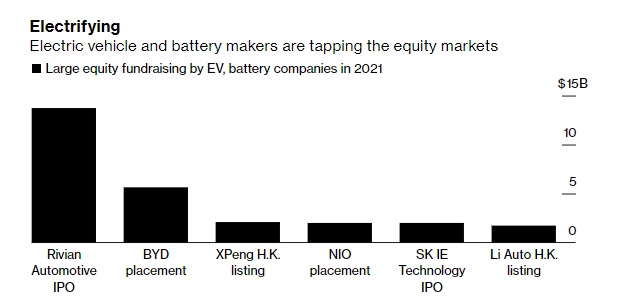 2021年规模最大的IPO正是来自该行业,电动卡车制造商Rivian (RIVN.US)本月早些时候在美国上市,融资137亿美元,目前股价较发行价上涨了47%。