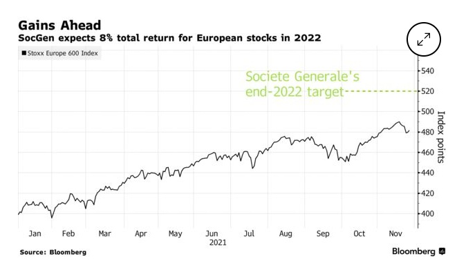 法国兴业银行预计,欧洲股市指数在2022年的涨幅将达到8%