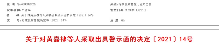 广西证监局决定,对皇氏集团董事长黄嘉棣,董事、副总裁杨洪军,董事会秘书王婉芳,财务总监孙红霞,时任董事会秘书何海晏,时任董事、副总裁宗剑,筑望科技董事长、总经理葛炳校采取出具警示函的行政监管措施。上述人员应认真汲取教训,配合公司做好各项整改工作,在收到本决定书之日起20个工作日内向广西证监局提交书面报告。