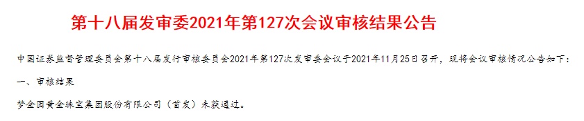 智通财经APP获悉,据中国证监会官网11月25日消息,梦金园黄金珠宝集团股份有限公司(首发)未获通过。
