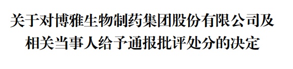 经深交所纪律处分委员会审议通过,深交所作出如下处分决定:一、对博雅生物制药集团股份有限公司给予通报批评的处分;二、对博雅生物制药集团股份有限公司原控股股东深圳市高特佳投资集团有限公司及其控制的广东丹霞生物制药有限公司给予通报批评的处分;三、对博雅生物制药集团股份有限公司董事长廖昕晰、总经理梁小明、财务总监涂言实、时任财务总监范一沁给予通报批评的处分。