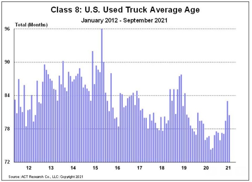 “在我们收集的二手卡车数据中,我们看到出售的8级卡车的平均年龄从2020年10月的74个月周期低点上升到2021年8月的83个月。到了9月份,这个数字下降到了80个月。”“我们认为,这是一个暂时的情况,随着更多新卡车的出现,情况将开始逆转。”