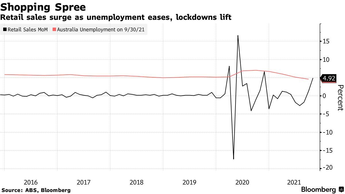 智通财经APP获悉,澳大利亚统计局今日公布的最新数据显示,10月份澳大利亚零售销售额环比增幅达4.9%,9月环比增幅为1.3%。该项最新数据是经济学家普遍预测2.2%增幅的两倍多,同时也是自2020年11月以来的最大增长幅度。