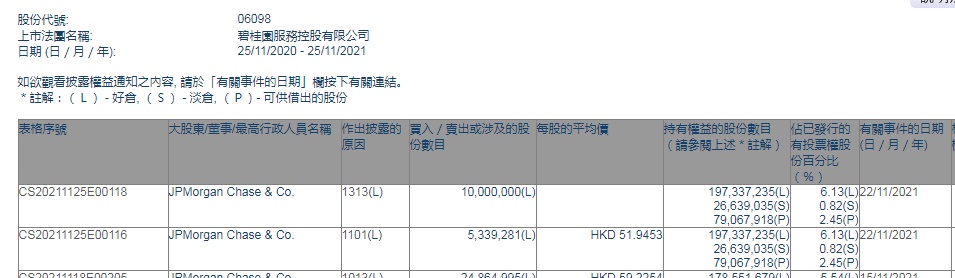 智通财经APP获悉,香港联交所最新资料显示,11月22日,小摩增持碧桂园服务(06098)533.9281万股,每股作价51.9453港元,总金额约为2.77亿港元。增持后最新持股数目约为1.97亿股,最新持股比例为6.13%。
