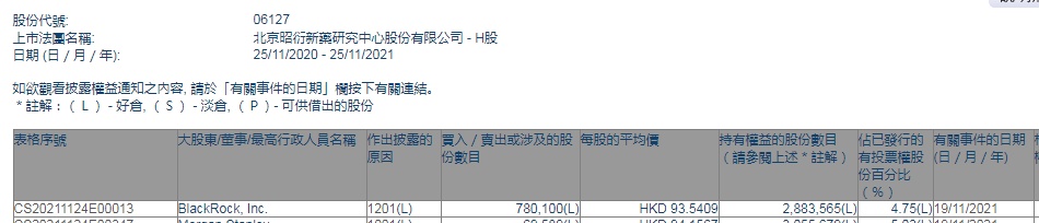 智通财经APP获悉,香港联交所最新资料显示,11月19日,贝莱德减持昭衍新药(06127)78.01万股,每股作价93.5409港元,总金额约为7297.13万港元。减持后最新持股数目约为288.36万股,最新持股比例为4.75%。