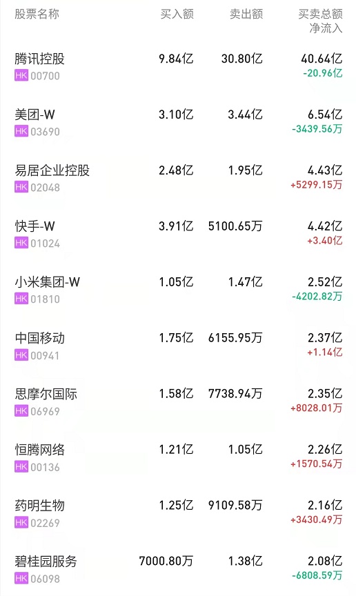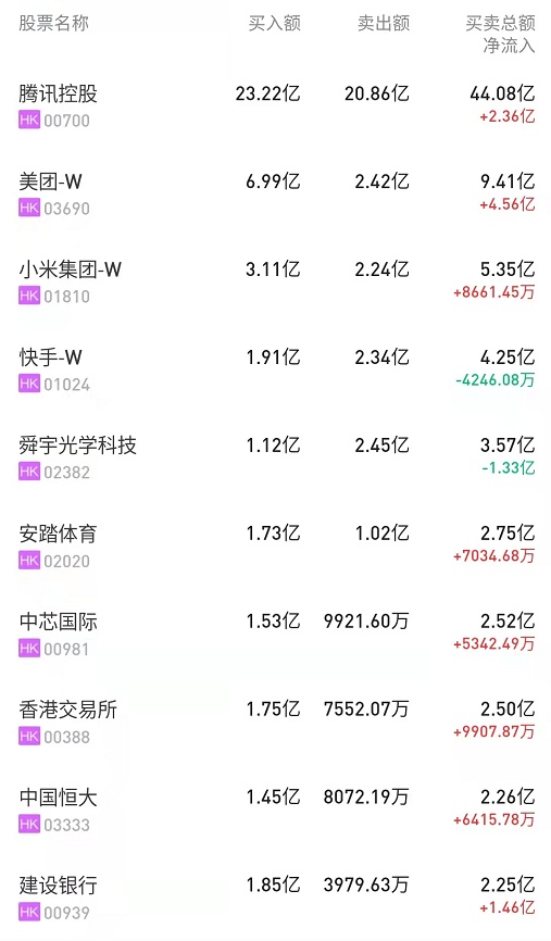 此外,建设银行(00939)、中国移动(00941)、安踏体育(02020)分别获净买入1.45亿、1.13亿、7034万港元。而舜宇光学(02382)遭净卖出1.33亿港元。