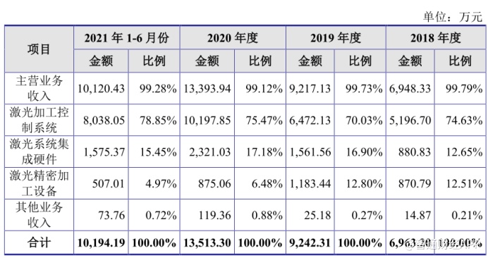 其中,激光加工控制系统被称为激光加工设备的“核心控制大脑”,决定设备加工精密水平、加工速率、自动化水平等加工能力的关键控制中心,也是金橙子科技当前最主要的收入来源。2018-2020年度及2021年上半年,激光加工控制系统业务为公司贡献的收入比重均在70%以上。