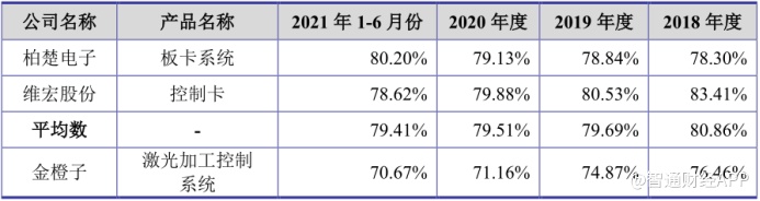 其中,相较产品功能或形态相似的同行可比公司而言,柏楚电子由于在国内中低功率激光切割控制领域中占有 60%左右份额,占据主导地位,综合毛利率水平维持在80%以上。相比之下,金橙子科技的综合毛利率水平与维宏股份较为接近。
