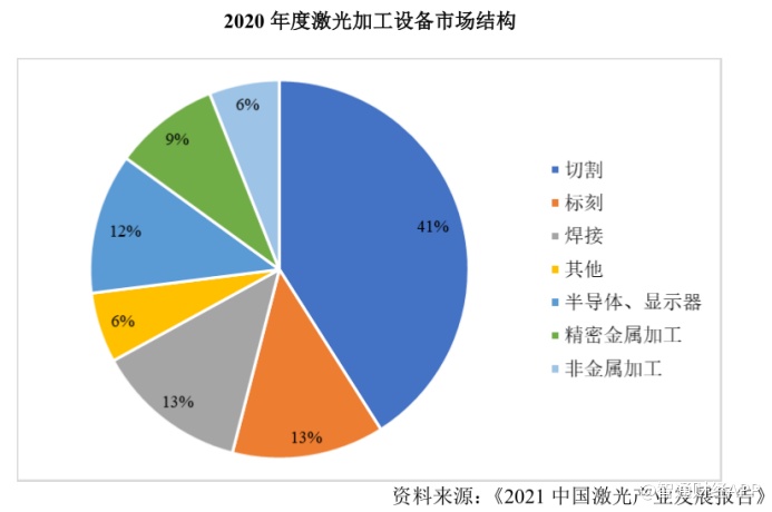 据《2021 年中国激光产业发展报告》数据显示,2020 年,国内工业激光设备市场规模达到432.1亿元,约占国内激光加工设备市场规模的 62.44%。而在工业激光设备的应用中,激光切割的占比最高,达41%;激光标刻与激光焊接则分别以13%并列第二。
