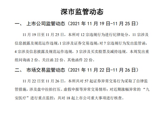 智通财经APP获悉,据深交所11月26日消息,11月22日至11月26日,深交所共对57起证券异常交易行为采取了自律监管措施,涉及盘中拉抬打压、虚假申报等异常交易情形;对近期涨幅异常的