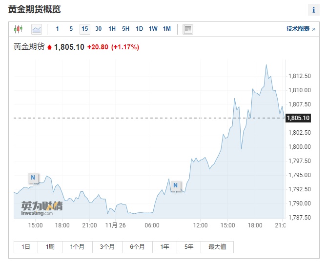 智通财经APP获悉,由于在南非发现了具有高传染性的新型冠状病毒变种,人们担心这将对全球经济复苏造成影响,因此黄金价格大幅上涨,黄金股也跟随上扬。截至发稿,12月Comex黄金涨1.17%,至1805.1美元/盎司。