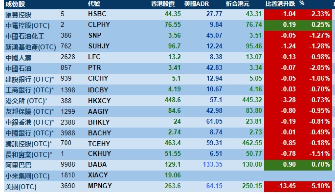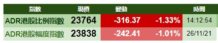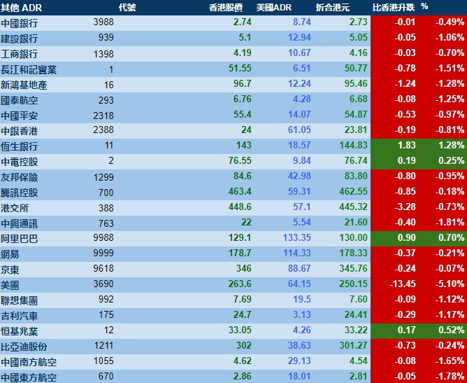 智通财经APP获悉,周五美股三大指数集体收跌,港股ADR指数下跌,按比例计算,收报23764点,跌316.37点或1.33%。