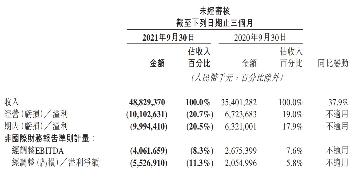 智通财经APP获悉,美团-W(03690)于11月26日盘后发布了2021年第三季度的业绩。财报显示,美团三季度营收实现488.3亿元,高于市场预估的485.7亿元,较去年同比增长37.9%;净亏损99.94亿元,经调整亏损55.27亿元,稍多于市场预期的52.4亿元。