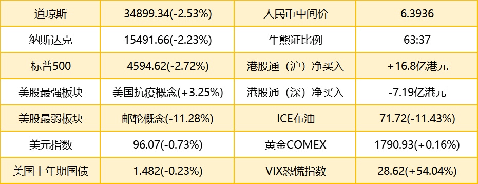 1. 因感恩节假期,美股休市一天,上周五提前3小时休市,交易时段为北京时间22:30至次日02:00。截至收盘,道指跌905.04点或2.53%,报34899.34点;纳指跌353.57点或2.23%,报15491.66点;标普500指数跌106.84点或2.27%,报4594.62点。上周,道指累跌1.97%,纳指累跌3.52%,标普500指数累跌2.2%。港股ADR指数下跌,按比例计算,收报23764点,跌316.37点或1.33%。