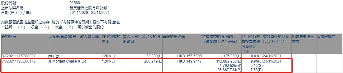 智通财经APP获悉,香港联交所最新资料显示,11月23日,小摩减持新奥能源(02688)26.8219万股,每股作价149.9447港元,总金额约为4021.80万港元。减持后最新持股数目约为1.13亿股,最新持股比例为9.99%。