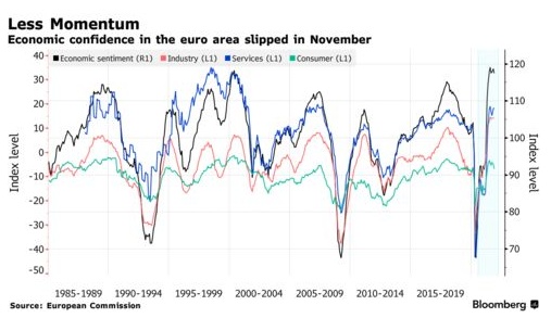 智通财经APP获悉,由于消费者疲于应对通胀飙升,以及新冠病毒死灰复燃令该地区再次成为疫情热点,欧元区11月经济信心下滑。根据欧盟会周一公布的数据显示,11月经济景气指数由上月的118.6降至117.5。