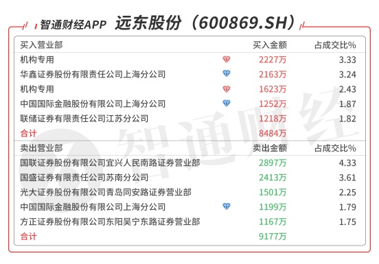 远东股份(600869.SH):多主力现身龙虎榜,机构席位买入3851万元,买一是知名游资的席位买入2163万元,当日买卖均衡,该股今日放量突破大平台强势涨停,从前面的股性来看,预计是走趋势行情。