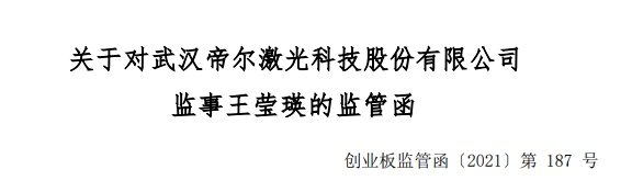 智通财经APP获悉,11月29日,深交所向武汉帝尔激光科技股份有限公司(帝尔激光,300776.SZ)监事王莹瑛发出监管函。监管函指出,帝尔激光 2020 年限制性股票激励计划第一个归属期的归属股份于 2021 年 11 月 19 日上市流通。王莹瑛的配偶余建本次获得授予股份 16,000 股,授予价格为 89.07 元/股,余建于股份上市当日将该次归属获得的 3,000 股股份卖出,构成短线交易,成交金额 599,100 元。王莹瑛作为公司的监事,未能督促配偶合规买卖股票,违反了深交所相关规定。