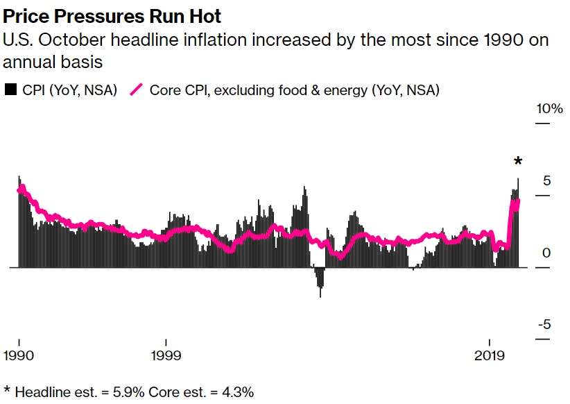 即使在疫情带来的挑战中,美国经济仍在向前发展。摩根大通经济学家已将美国经济今年最后三个月的年化增长率预期从5%上调至7%。不过这种繁荣推高了通胀,10月份消费者价格指数以30年来最快的速度上涨。