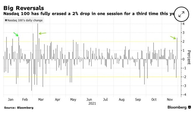 纳斯达克100指数今年第三次在一个交易日内完全收复了2%跌幅的失地