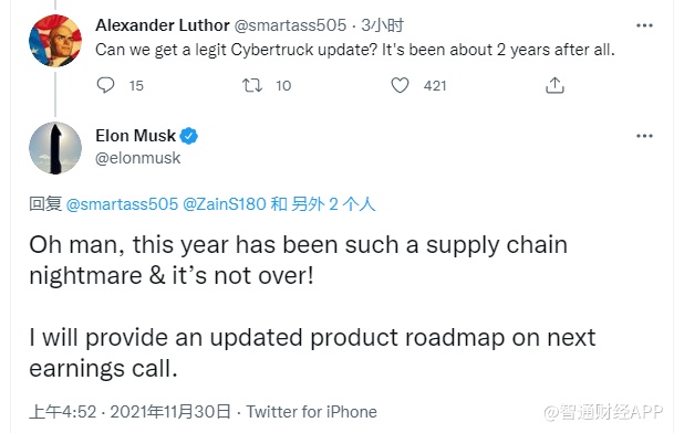 智通财经APP获悉,特斯拉(TSLA.US)CEO埃隆·马斯克周一在推特上表示,电动卡车Cybertruck生产面临供应链问题带来的挑战。他还表示将出席特斯拉第四季度的财报电话会议,并提供最新的产品路线图。