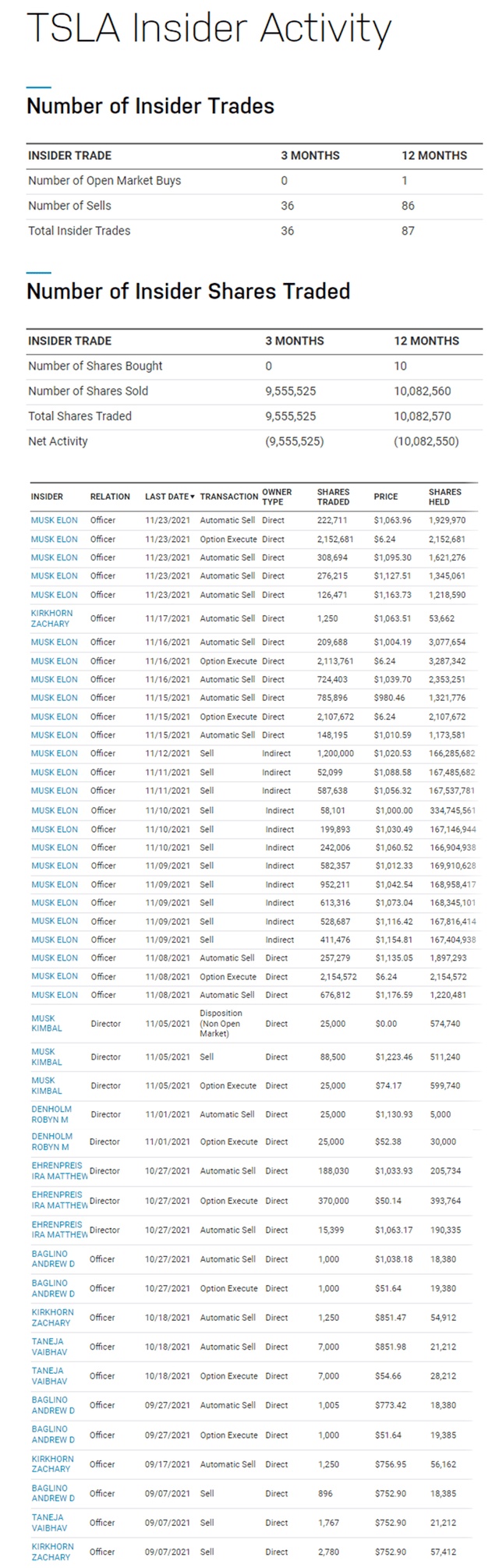 截至11月23日的三个月时间里,该公司内部人士出售了价值100亿美元的股票,约占其市值的1%;根据纳斯达克交易所的追踪数据,与之前9个月相比,被清算的股票增加了20倍。以下是自9月7日以来的内部交易情况。