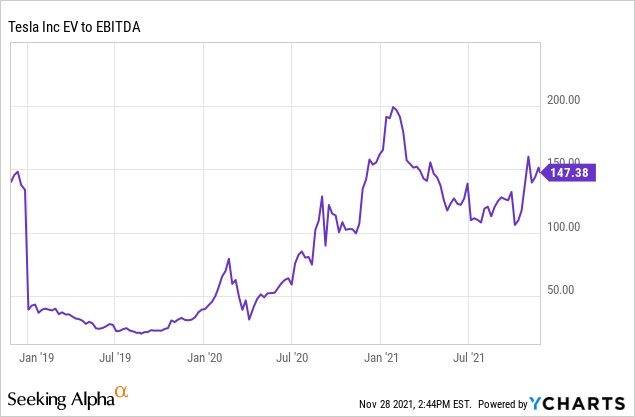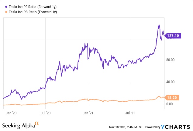 其他估值指标同样显示出,即使特斯拉高速增长的势头得以维持下去,目前这只股票仍然很昂贵。当前的定价可能已经达到了完美的水平,未来的利好或许无法把股价推高到现在的1000美元以上。从2019年的40美元飙升到2021年11月初的1243美元,这样的事情是很罕见且不太可能重复的。