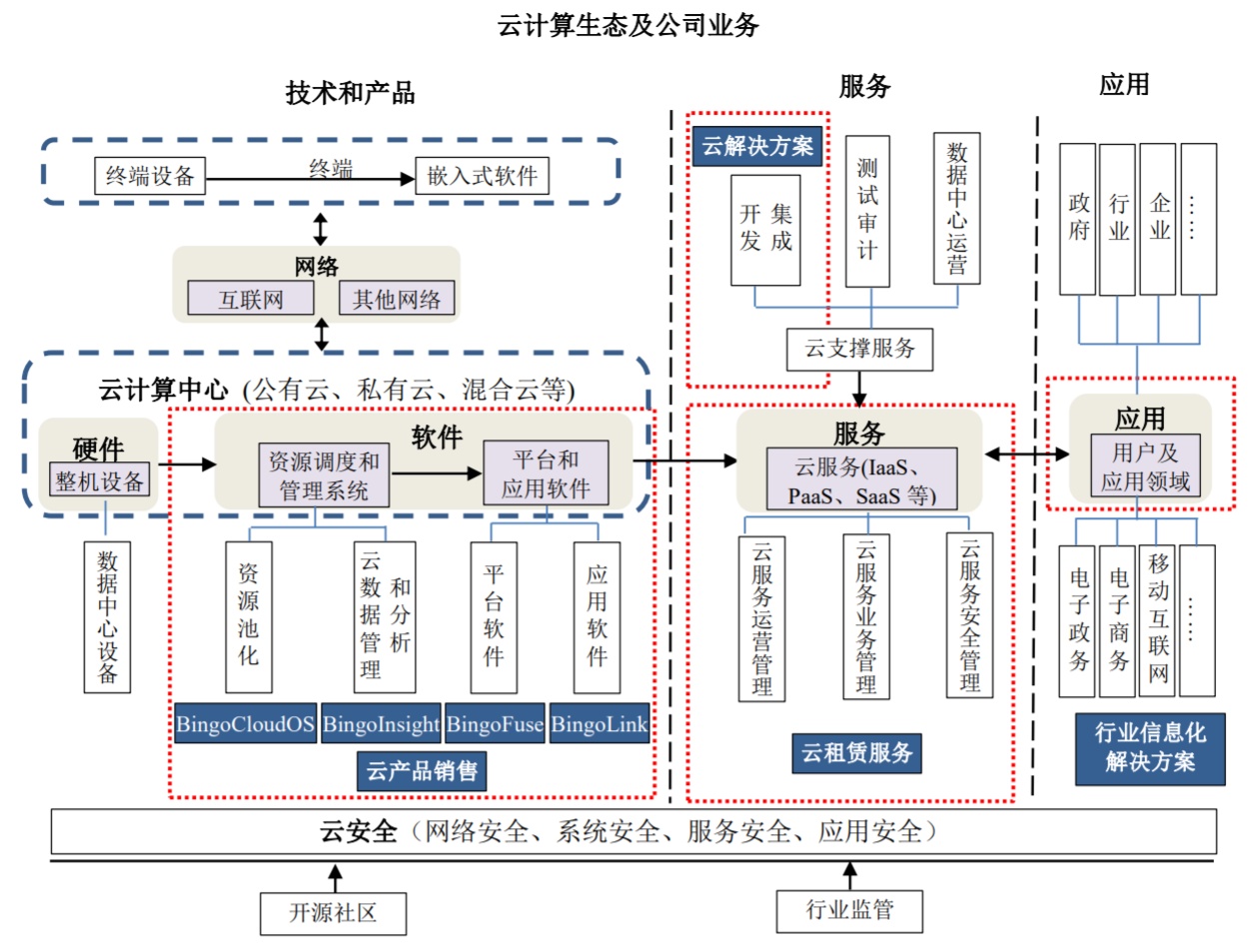 品高软件的业务可以分为两部分,分别是云计算业务以及行业信息化业务。其中的云计算业务以自主研发的云产品作为基础,为客户的系统入云、应用入云、数据入云提供相应的支持,同时为客户提供基础架构和平台层面的相关服务。品高软件已经拥有通过云计算为核心的基础产品,包括BingoCloudOS、BingoFuse、BingoInsight以及BingoLink等。
