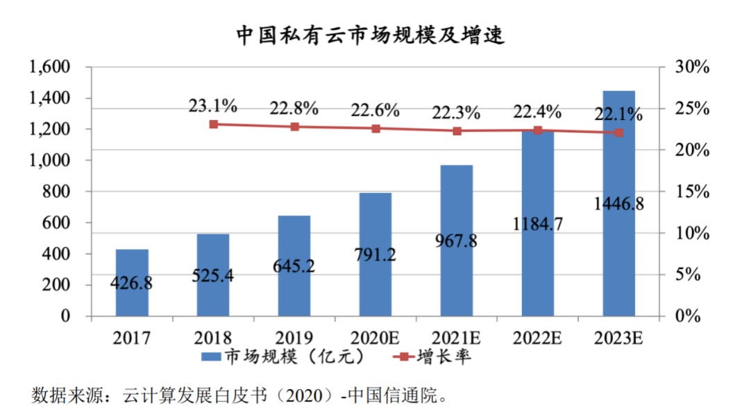 云计算技术以及产业不断成熟,全球的云计算市场规模也处于上升趋势,我国的云计算市场虽然发展较晚,但已然成为促进经济增长、加速产业转型的助力。2018年,我国的云计算市场规模达到962.8亿元,较同期增长39.2%,其中的私有云市场规模为525.4亿元,涨幅23.1%。中国信息通信研究院预计,未来几年该市场将持续增长,2023年规模将达到1446.8亿元。