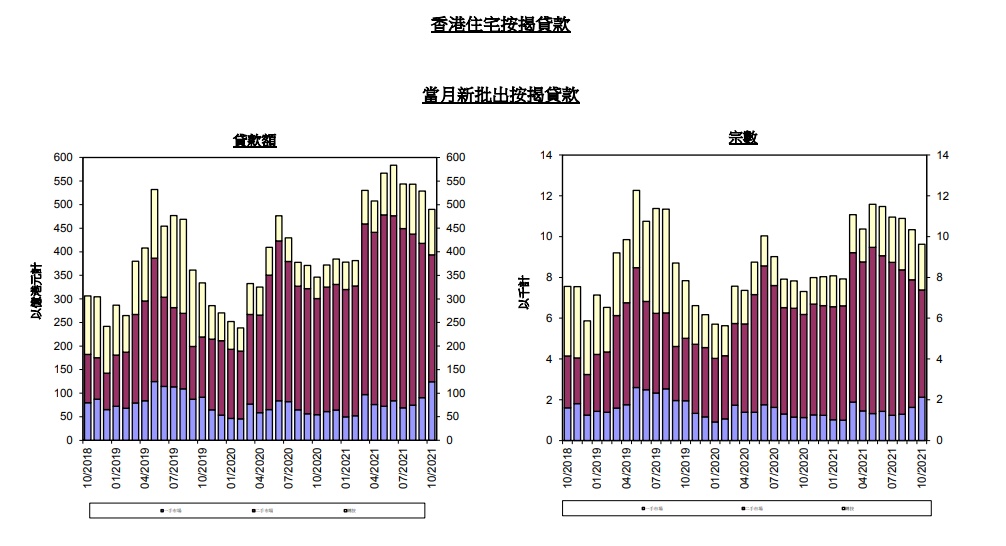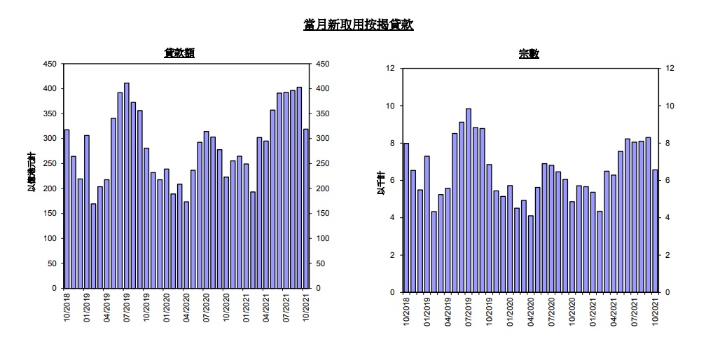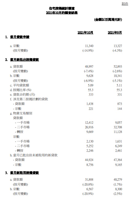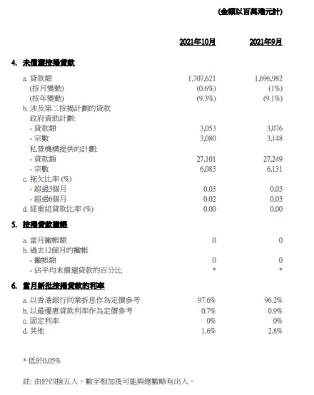 以香港银行同业拆息作为定价参考的新批按揭贷款所佔比例,由9月份的96.2%上升至10月份的97.6%。以最优惠贷款利率作为定价的新批按揭贷款所佔比例,由9月份的0.9%下降至10月份的0.7%。10月底未偿还按揭贷款总额按月增加0.6 %,至17,076亿港元。按揭贷款拖欠比率维持于0.03%,经重组贷款比率维持于接近0%。