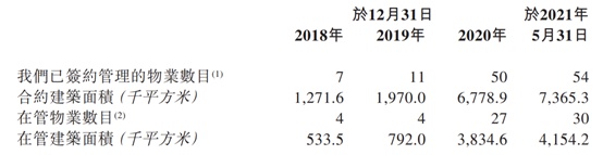 从增长速度来看,德商产投服务的在管建筑面积由2018年的约53.35万平方米增加至2020年的约383.46万平方米,年复合增长率约为175.7%;合约建筑面积由2018的约130万平方米增加至2020年的678万平方米,年复合增长率约为128.7%。