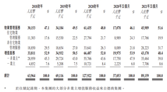 从收入结构上来看,往绩中该公司大部分收益产生自德商集团。2018-2020年及2021年首五月,来自德商集团的收益分别占53.4%、51.0%、47.3%及38.8%。此外,同期物业管理服务收益的100%、100%、68.8%及43.4%分别产生自德商集团开发的物业。