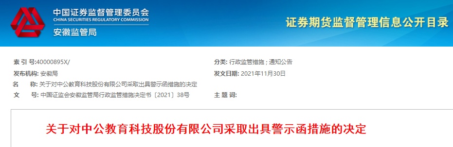 安徽证监局提出:中公教育应深刻吸取教训,认真学习相关法律法规,严格规范内部审批程序及信息披露行为,杜绝类似违规行为再次发生。