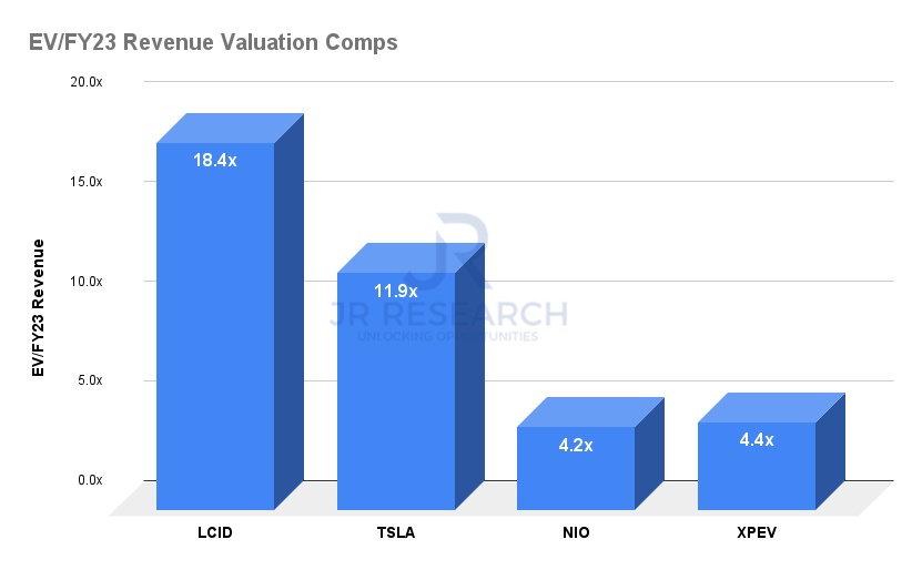 估值方面,Lucid目前的EV与2023财年预期营收比值为18.4倍。与同行相比,Lucid的估值看起来非常高。特斯拉此项比值为11.9倍,蔚来(NIO.US)和小鹏(XPEV.US)分别为4.2倍和4.4倍。