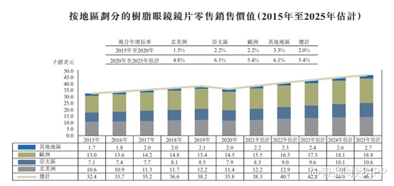 不仅如此,全球树脂眼镜镜片的零售销售价值总额增长缓慢,由2015年的324亿美元增加至2020年的358亿美元,复合年增长率仅为2.0%。沙利文预计至2025年市场将增长至465亿美元,2020年至2025年复合年增长率也仅为5.4%。