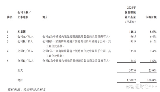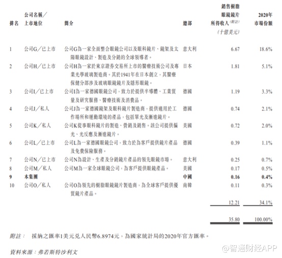 不仅是国内市场集中度高,全球的树脂眼镜镜片市场集中度更高,十大眼镜公司在2020年合共产生122.1亿美元的收入,占市场的34.1%。康耐特光学在整个市场排名第九,约占0.4%。