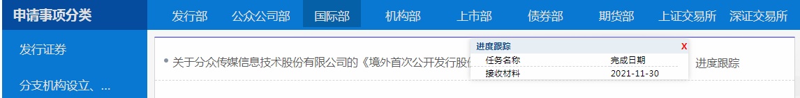 智通财经APP获悉,11月30日,证监会公布分众传媒信息技术股份有限公司(分众传媒,002027.SZ)的《境外首次公开发行股份(包括普通股、优先股等各类股票及股票的派生形式)审批》的进度,目前进度已达接收材料阶段。