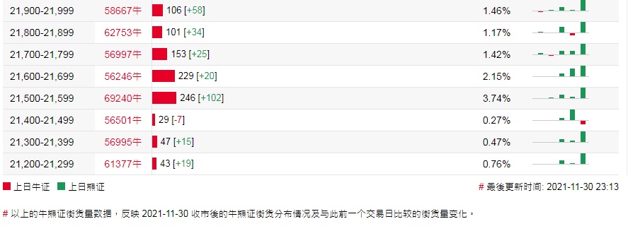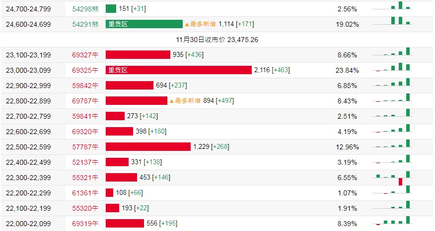 牛证街货重货区在23,000-23,099区间,该区间最新牛证数量为2116张,较上一交易日增加463张;最多新增在22,800-22,899区间,该区间最新牛证数量为894张,较上一交易日增加497张。