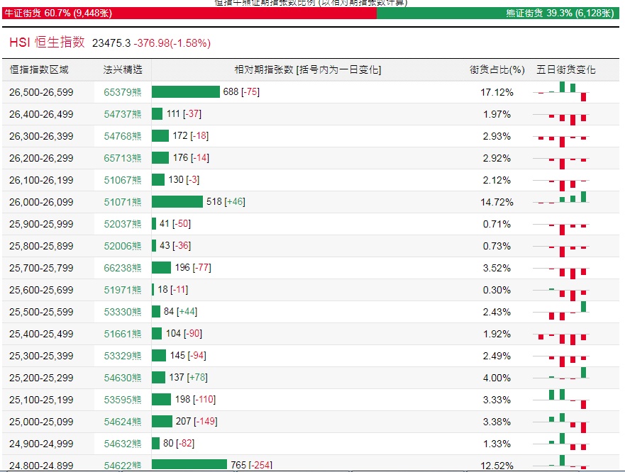 法兴恒指牛熊证街货分布图中的数据显示,熊证街货重货区在24,600-24,699区间,该区间最新熊证数量为1114张,较上一交易日增加171张;最多新增在相同区间。