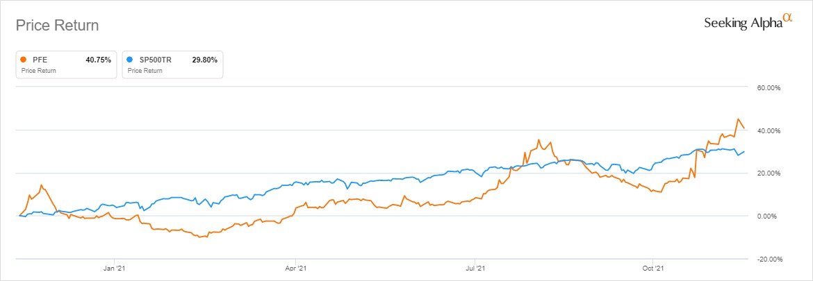 辉瑞的股价在过去的12个月里攀升了40.8%,表现好于大盘。得益于与BioNTech (BNTX.US)共同开发的新冠疫苗的销售,该公司营收在过去一年了翻了一番以上。