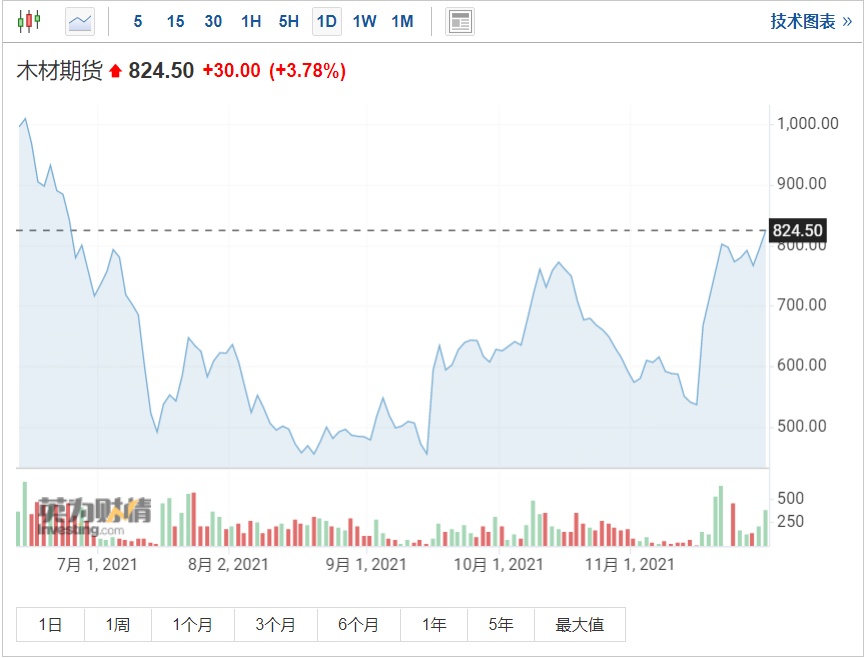 由于木材供应的不确定性,芝加哥木材期货周二上涨了近4%,达到每1000板英尺824.50美元,这是自6月下旬以来的最高价格。在过去两周,木材价格上涨了30%。