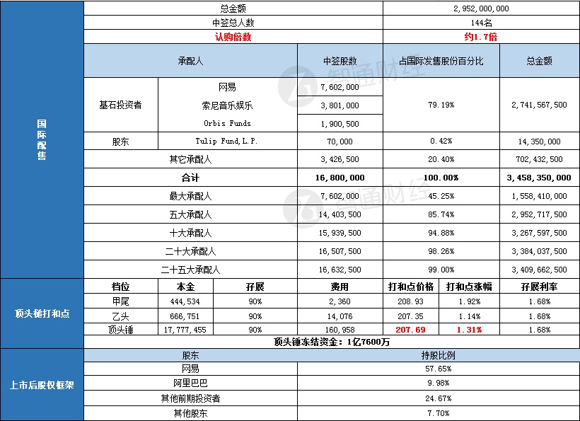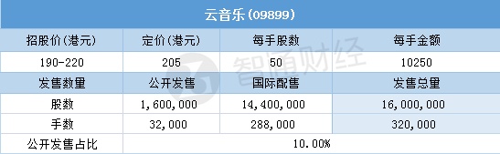 智通财经APP获悉,12月1日,云音乐(09899)配售结束,配售招股价190-220港元,最终定价205港元,每手10250港元。
